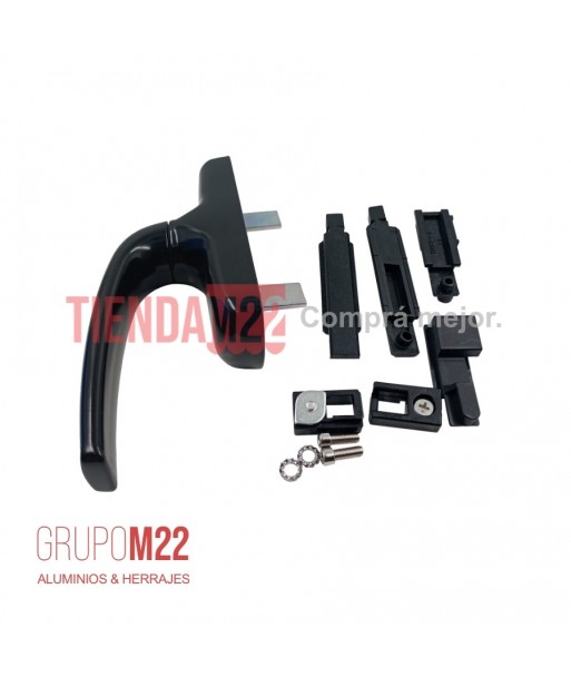 Cremona ambidiestra, con mango con opción de bloqueo mediante llave, rotación a 90° (hoja practicable) o 90° y 180° (oscilo batiente) y tope de posición en apertura y cierre.