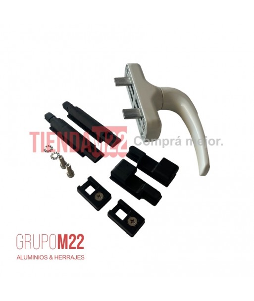 Cremona ambidiestra, con mango con opción de bloqueo mediante llave, rotación a 90° (hoja practicable) o 90° y 180° (oscilo batiente) y tope de posición en apertura y cierre.